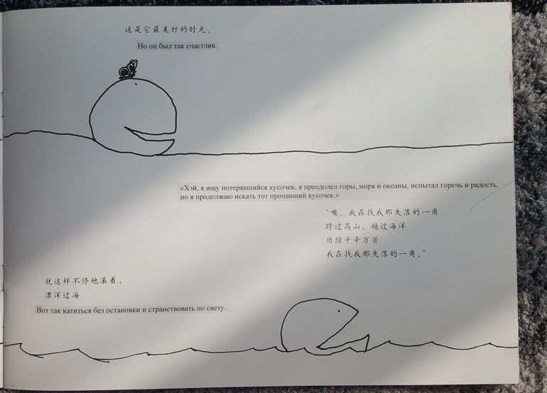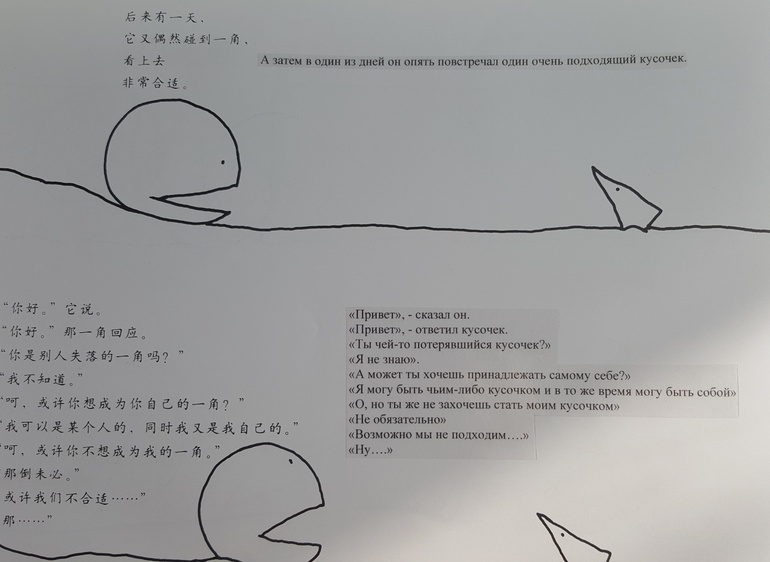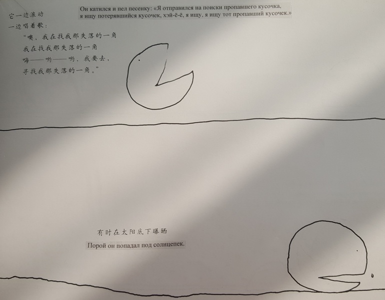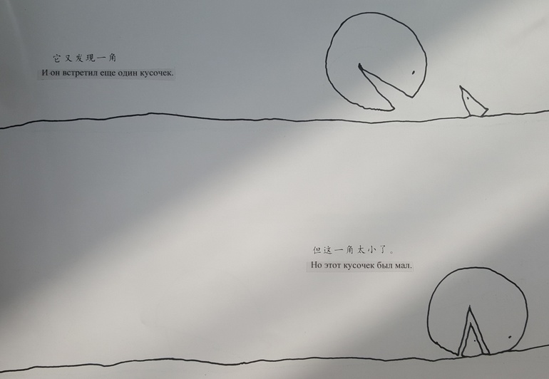 Книга, удивившая и поразившая меня - «Пропавший кусочек» Шела Силверстайна. Мы знакомы с Силверстайном по таким книгам, как «Полтора жирафа», «Продаётся носорог», «Лафкадио», «Щедрое дерево». Жаль, что самая известная книга этого автора «Потерявшийся кусочек» ещё не переведена на русский язык. Как и другие книги Силверстайна, эта история также не вписывается только в рамки детской литературы. Это детская книга со взрослыми смыслами, именно «смыслами» во множественном числе, ведь каждый подумает о чем-то своем (о своих утратах или обретениях, о гармонии в своей жизни и путях её достижения….).