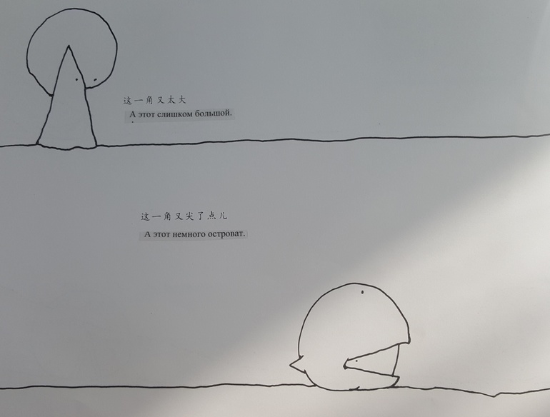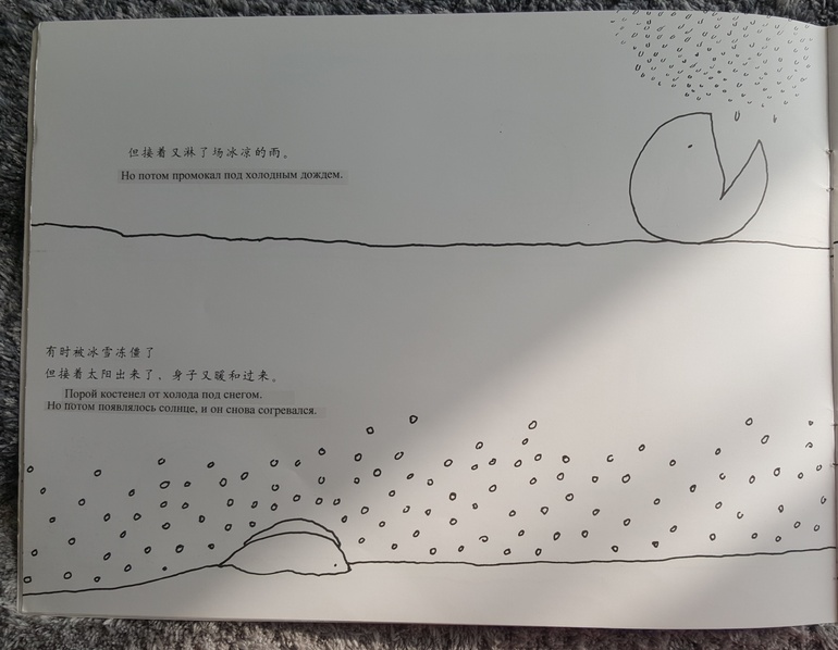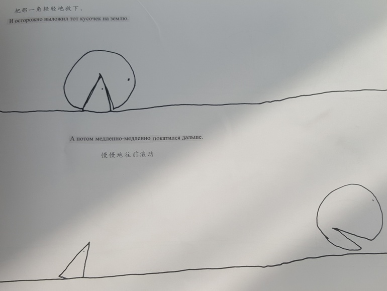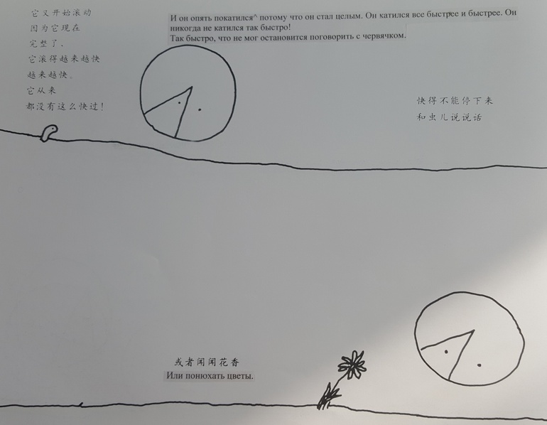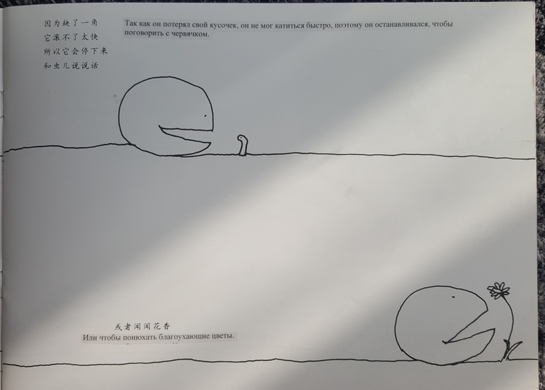 В книге описывается простая история о том, как Незавершенный предмет путешествует по свету в поиске своего утерянного кусочка. Незавершенный предмет живет в предвкушении того счастливого момента встречи с этим кусочком. В этом состоянии радостного предвкушения он путешествует и попутно успевает насладится мелочами, которые дарит ему такая жизнь. Несколько неудачных встреч, и потерянный кусочек найден. Но, как оказалось, именно жизнь в предвкушении, радость от того, что у жизни есть этот смысл «найти что-то» - это и была та настоящая счастливая реальность, которую Незавершенный предмет пытался ощутить. Выложу фото некоторых разворотов. Перевод делала сама, так что возможны некоторые погрешности, не судите строго.