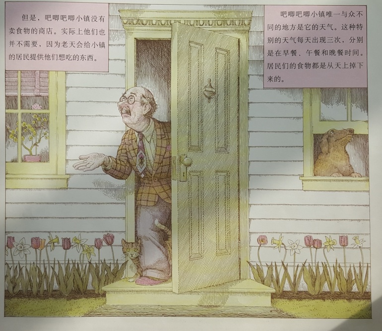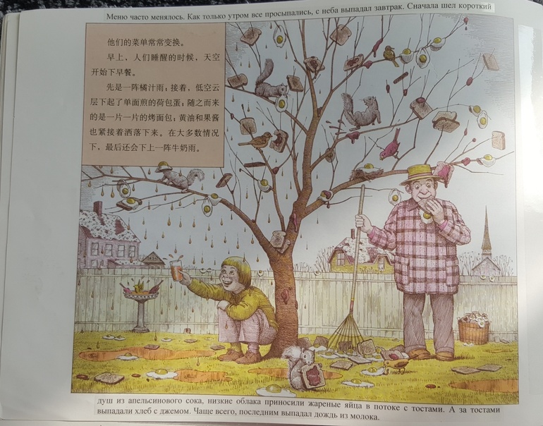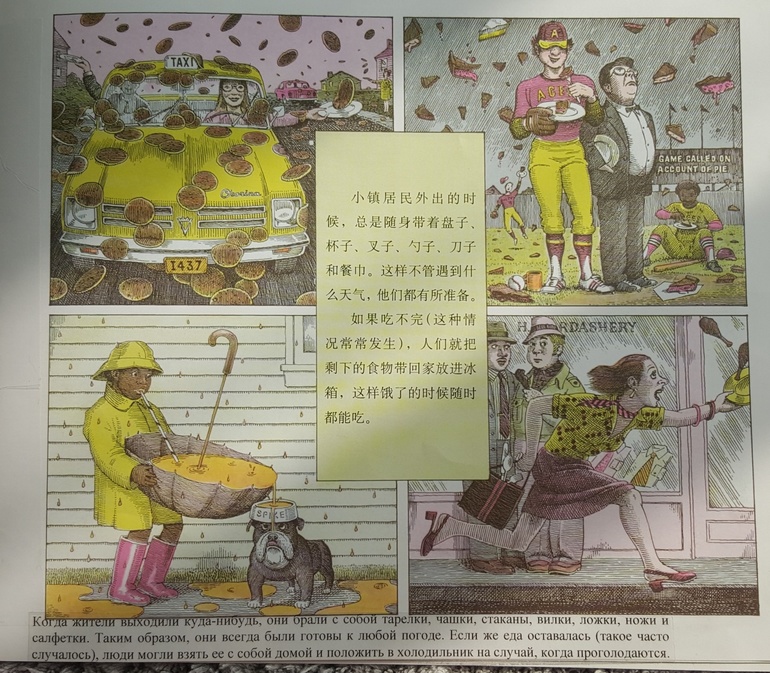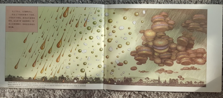 Люди ели то, что приносила им погода. Но дождь выпадал не в виде капель, а снег не в виде снежинок и ветер никогда не дул. С дождем выпадал суп и сок, со снегом выпадало картофельное пюре и зеленый горошек, а вечером случался шторм из гамбургеров.
