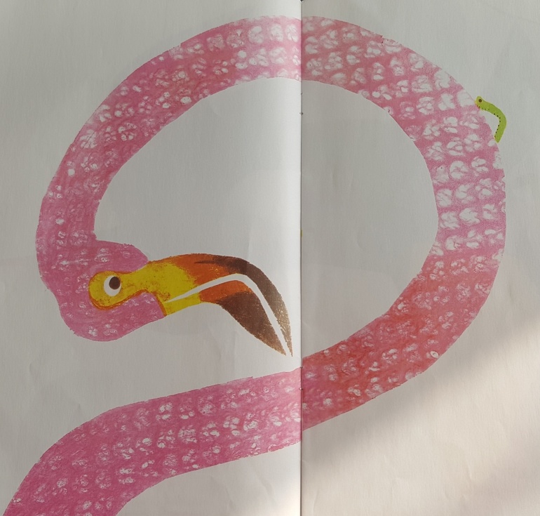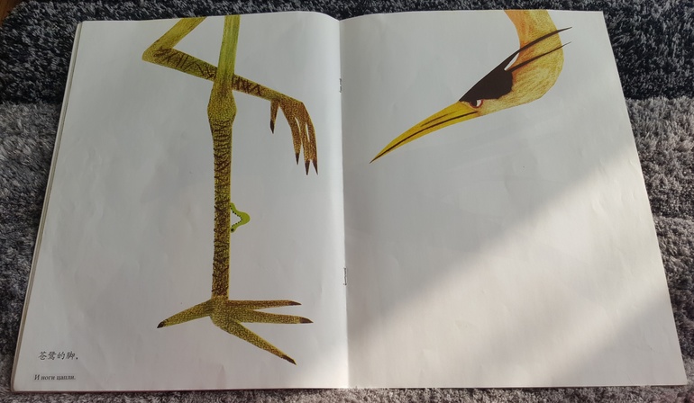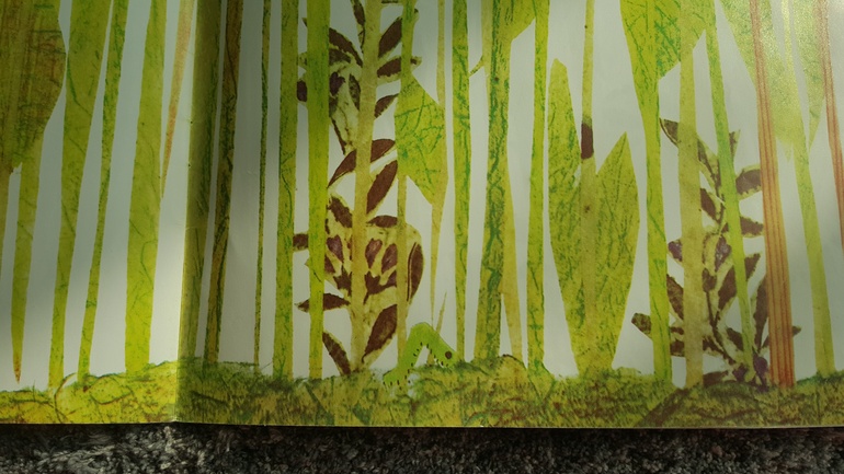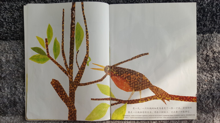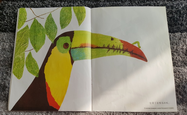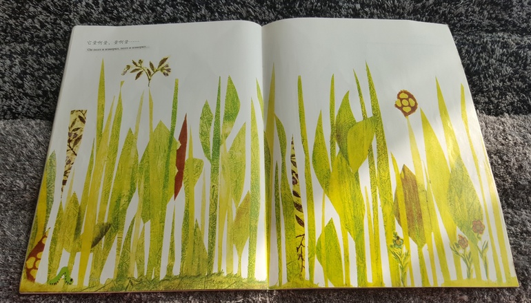 Как, например, вот эту книгу. "Inch by Inch" - история про червячка, который нашёл способ обхитрить птичку и не оказаться съеденным. На каждом развороте мы просто ищем червячка и следим за его передвижениями. По содержанию история чем-то напоминает басню. Книга есть и в картонном варианте, но у меня тонкая.