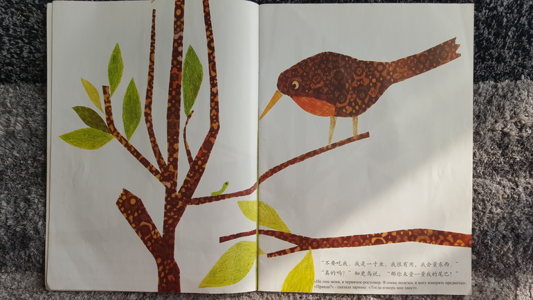 "Не ешь меня, я червячок-ростомер. Я очень полезен, я могу измерять предметы". "Правда?" - спросила зарянка, - "тогда измерь мне хвост".