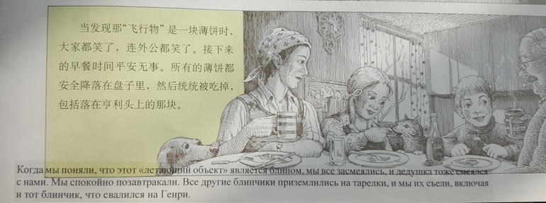 Когда мы поняли, что этот «летающий объект» является блином, мы все засмеялись, и дедушка тоже смеялся с нами. Мы спокойно позавтракали. Все другие блинчики приземлились на тарелки, и мы их съели, включая и тот блинчик, что свалился на Генри.