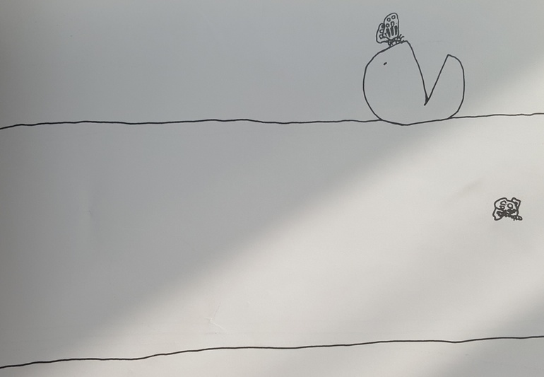 Так как он потерял свой кусочек, он не мог катиться быстро, поэтому он останавливался, чтобы поговорить с червячком. Или чтобы понюхать благоухающие цветы.
