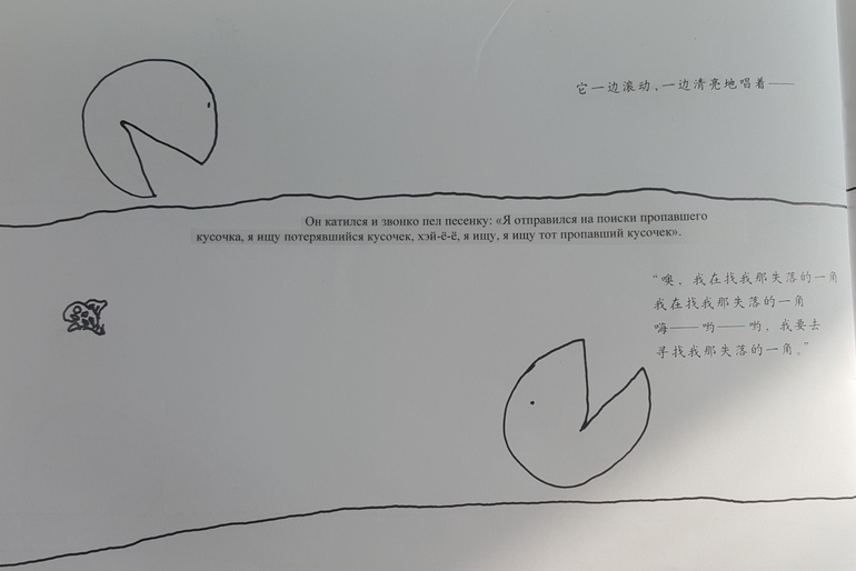 Он катился и звонко пел песенку: "Я отправился на поиски пропавшего кусочка, я ищу потерявшийся кусочек..."