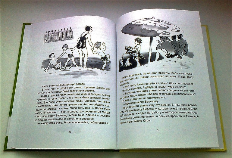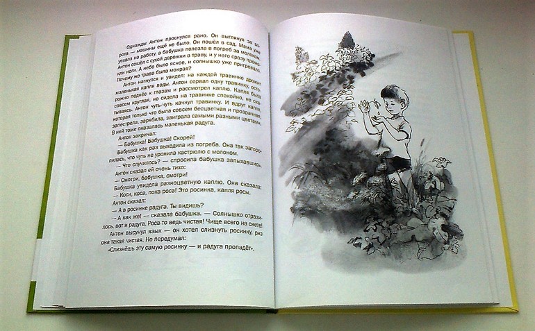 Герой книги - шестилетний Антон. Книжечка сравнительно небольшая по объему, состоит из коротких рассказов. Тема - повседневная жизнь детей (то что надо! В книжечке рассказывается о том, почему Антон сначала не хотел ходить в детский сад, а потом пошёл (друг появился - ответственность), о том, что лучше бы не делать то, что запрещают взрослые (уходить далеко и прыгать в незнакомые ямы), о жизни на даче, о том, как дети учатся делиться (велосипедами - всё лето делили самокаты да велосипеды). Понравился момент, когда Антон увидел красивое - солнышко в капельке росы. Мальчик прислушивается в разговорам взрослых, слышит песни геологов (нашла я эту "Принцессу Беренику" - Александр Городницкий) и учится ответственности, ведь скоро в школу, а в школу нужно вставать рано, если хочешь стать первоклассником.