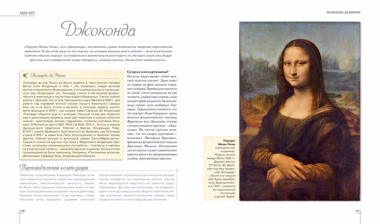 Блестящий текст раскрывает тайны каждого полотна, рассказывает об оригинальном творческом почерке создавшего его художника. Краткое изложение биографии живописца дополняет представление о мотивах, двигавших творцом при создании шедевра.