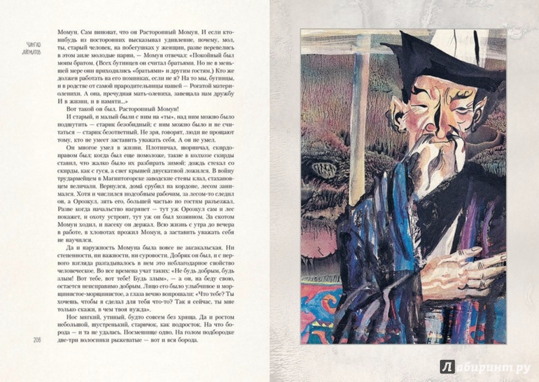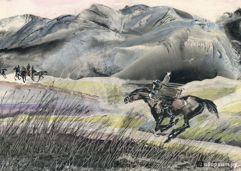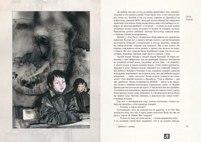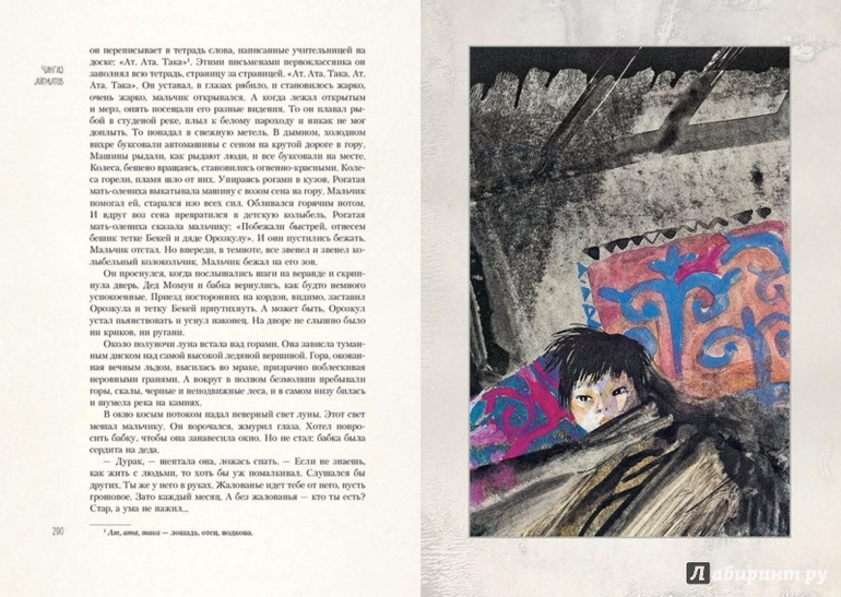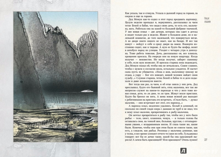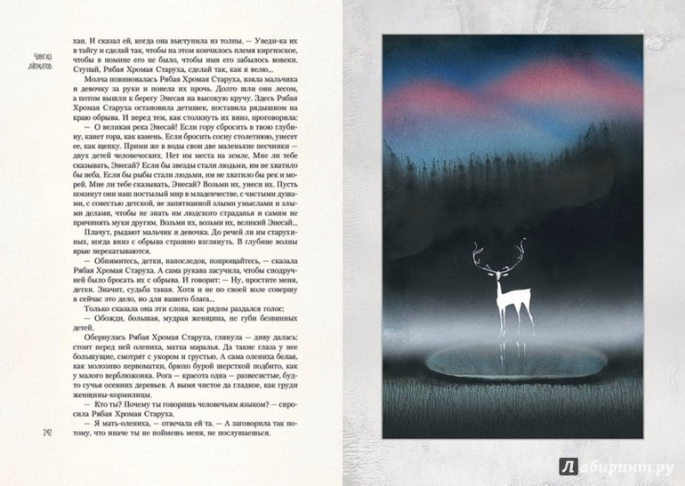 Иллюстрации Светозара Острова намеренно не акцентируют внимание на трагических событиях. Зато они созвучны самой прозе Айтматова, «суровой и нежной», проникнутой красотой природы и фольклорно-мифологическими мотивами. Поэтому на рисунках по совершенно пустынном миру мчится табун лошадей, Рогатая мать-олениха скачет сквозь время и пространство, а из морских глубин выныривает Рыба-женщина. Это те, кто помогут героям сделать правильный выбор.
