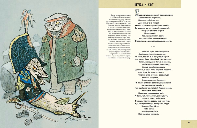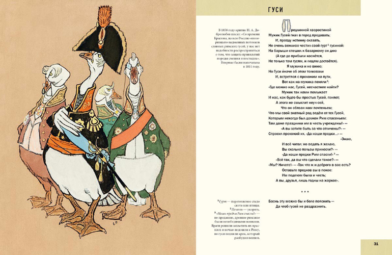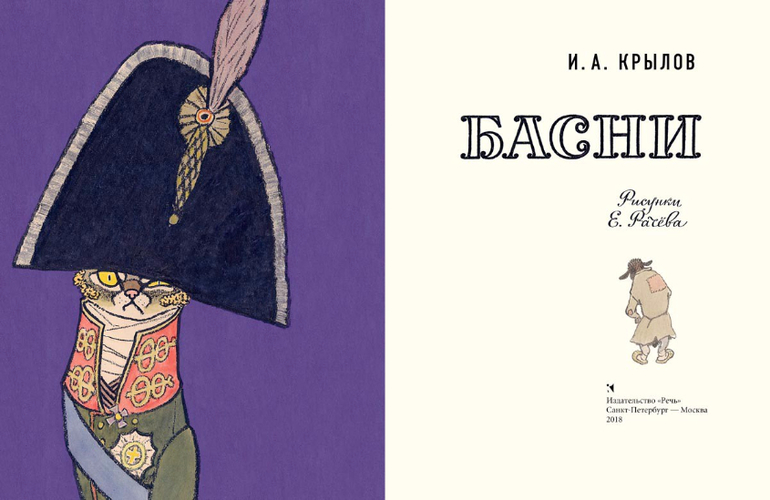 «А Васька слушает да ест»… «Слона-то я и не приметил»… «Да только воз и ныне там»… Фразы из басен И. А. Крылова запоминаются ещё в детстве и легко и непринуждённо используются в разговоре. Но писатель вкладывал в свои произведения особый смысл, и часто произведения Крылова были поэтическим откликом на конкретное историческое событие. Разобраться в подоплёке крыловских басен, узнать о поводе к их написанию помогут комментарии, данные к каждому тексту. Окунуться в эпоху Крылова помогут и образы одетых в исторические костюмы героев, созданные художником Евгением Рачёвым. На рисунках заложивший лапы за спину Волк и правда чем-то похож на Наполеона, прищуривший один глаз кот - на Кутузова, важные Гуси - на сановников, а одетая в капор Лисица - на даму начала XIX века.