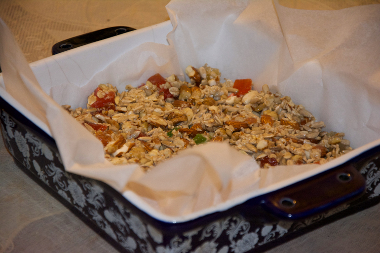 После запекания, ее нужно оставить до полного остывания, запекать 15-20 минут! Затем порезать на пластинки, получатся такие печеньки - мюсли)