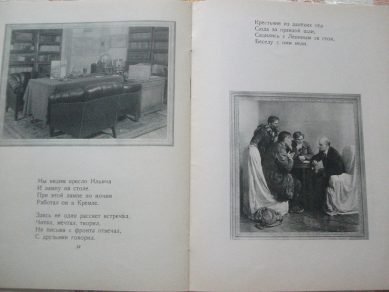 Мы видим кресло Ильича И лампу на столе. При этой лампе по ночам Работал он в Кремле. Здесь не один рассвет встречал, Читал, мечтал, творил, На письма с фронта отвечал, С друзьями говорил. Крестьяне из далеких сел Сюда за правдой шли, Садились с Лениным за стол, Беседу с ним вели.