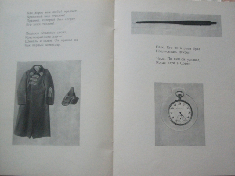 Как дорог нам любой предмет, Хранимый под стеклом! Предмет, который был согрет Его руки теплом! Подарок земляков своих, Красноармейцев дар - Шинель и шлем. Он принял их Как первый комиссар. Перо. Его он в руки брал Подписывать декрет. Часы. По ним он узнавал, Когда идти в Совет.