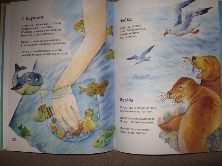 В книге два раздела: "Босиком бежим по лету" и "В животе у моря", т.е. книга очень-очень летняя получилась, такая "дачно-морская", "сладко-соленая" и теплая-теплая. Да и иллюстрации очень гармонично с текстами сочетаются.