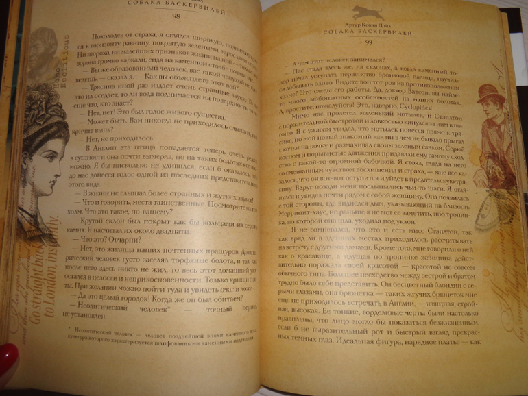 Долго выбирала Собаку Баскервилей от неожиданно полюбившего великого сыщика, остановилась на издании АСТ - книга классная! Обложка матовая с рисунком, имеется суперобложка, страницы мелованные плотные, неожиданно не белые! Иллюстраций на книгу немного, но каждый разворот оформлен зарисовками, фотографиями - очень здорово продуман макет! Сразу видно, что повесть, оформление, иллюстрации просто неотделимы друг от друга. АСТ молодцы!