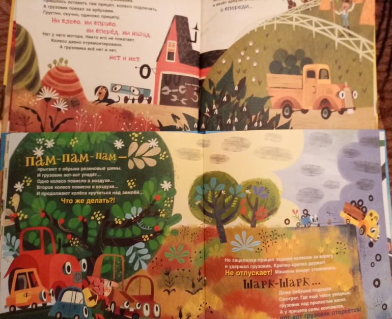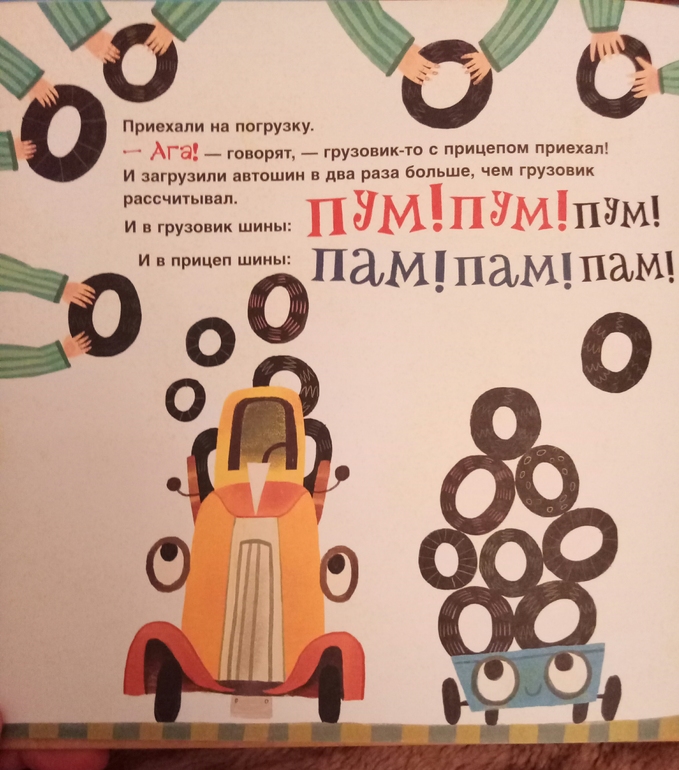 и что ж скрывать, на прицепе обиду свою срывать.. но прицеп не бросил, не обиделся, а в трудную минуты именно он и пришел на помощь , как бы так помягче выразиться, творящему глупости грузовичку.. и все кончится, конечно же, хорошо и дружно) На развороте книги представлен отзыв писателя А. Снегирева, где он пишет, что книга про любовь, предательство и верность! и я полностью согласна! А разве можно перерости такие понятия?а еще , как и в первой части, я увидела здесь отношения родителей и детей.. как иногда бывает, мы вот напланируем себе дел, вот сейчас уснет, или будет играть, а я пойду чай попить, ужин готовить, в инете сидеть,пост писать, выберете нужное) а он не спит и все тут,и все твои планы насмарку, и конечно, порой появляется раздражение.. и ничего хорошего из этого раздражения не получается потом.. ну вот прям как у грузовичка.. я благодаря этой книге еще раз задумалась, как же безгранична любовь наших детей к нам, как они ранимы, как зависимы от нас , пока маленькие , и как же быстро они растут... так что ну его, этот чай, интернет и ужин, лучше книжку про грузовичок почитаем, а на ужин и сосисек поедим) вот видите, как почти сороколетняя мама расфилософствовалась от казалось бы такой детской книги) и мне кажется, и дети тоже найдут каждый для себя что то нужное и важное! да и притом просто книга замечательная, и слов звукоподражательных много, и понятия нужные в игровой форме повторить можно.