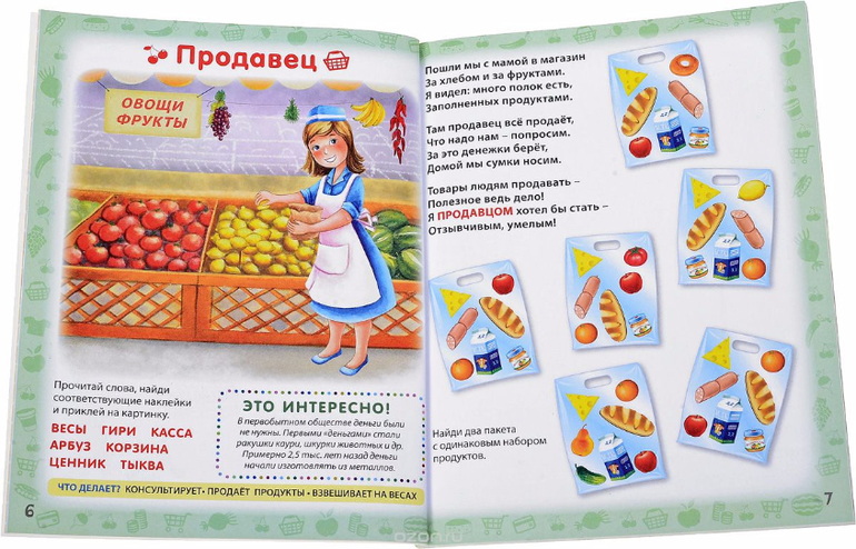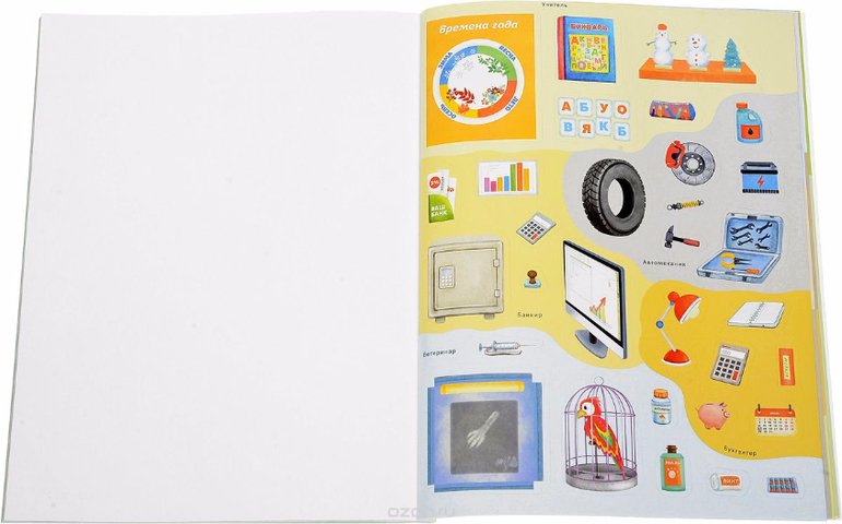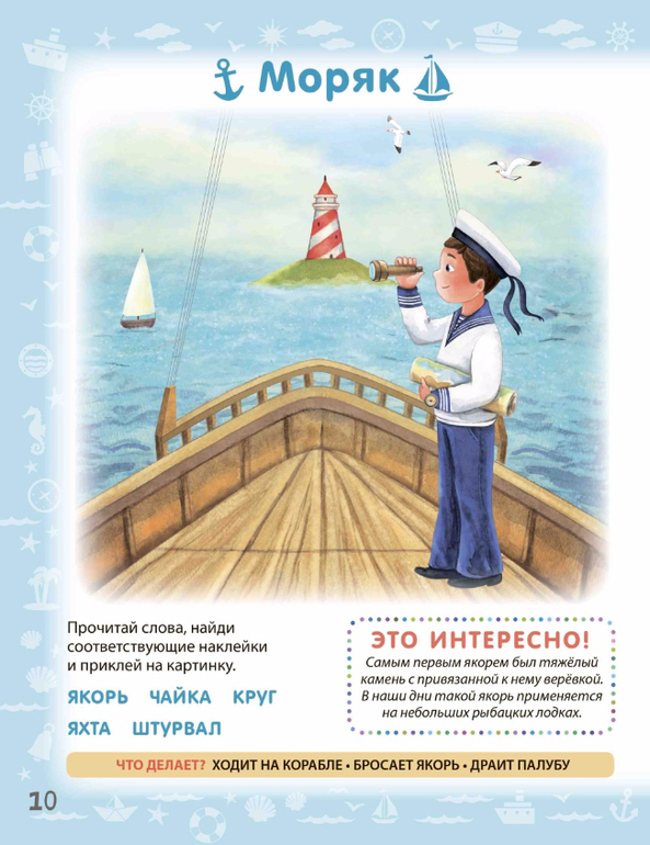 Каждый разворот книги посвящён одной профессии: юный читатель узнает, чем занимается специалист, а также выполнит разные задания: будет читать и писать, рисовать, играть, разгадывать головоломки и дополнять яркие иллюстрации наклейками.