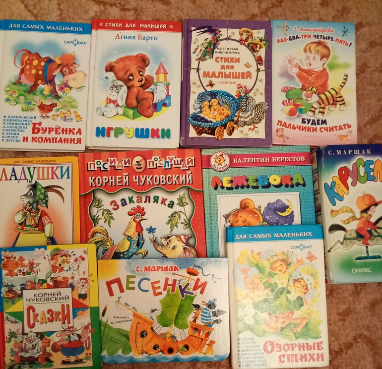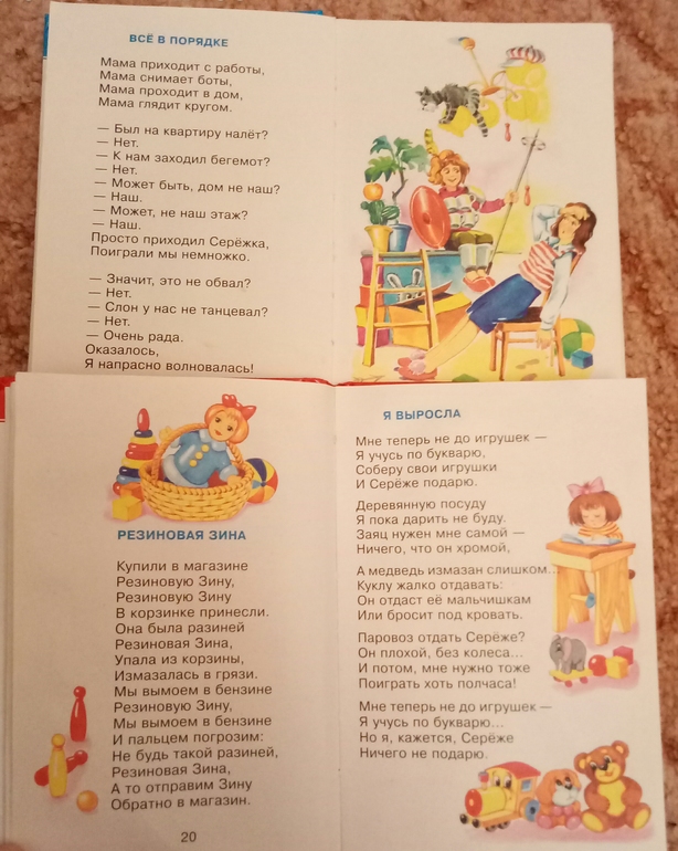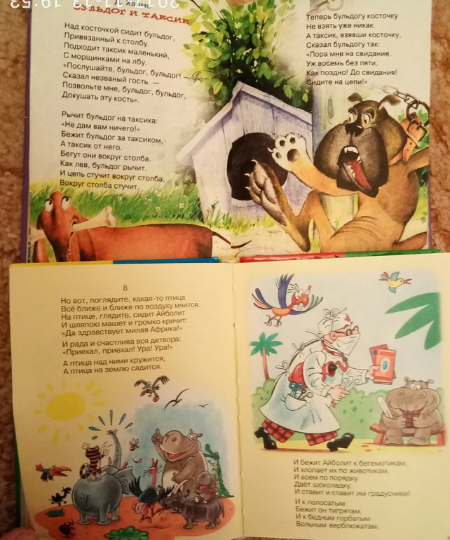 Очень люблю небольшие сборники, очень удобно. Стихи для малышей, несмотря на спорные рисунки, находка! именно оттуда выявляем любимчиков и покупаем более полные сборники. Полюбился Бульдог и таксик Хармса, играли,обыгрывали, купили еще сборничек) начали читать Айболита, опять же неравнодушны к развороту с шоколадом)