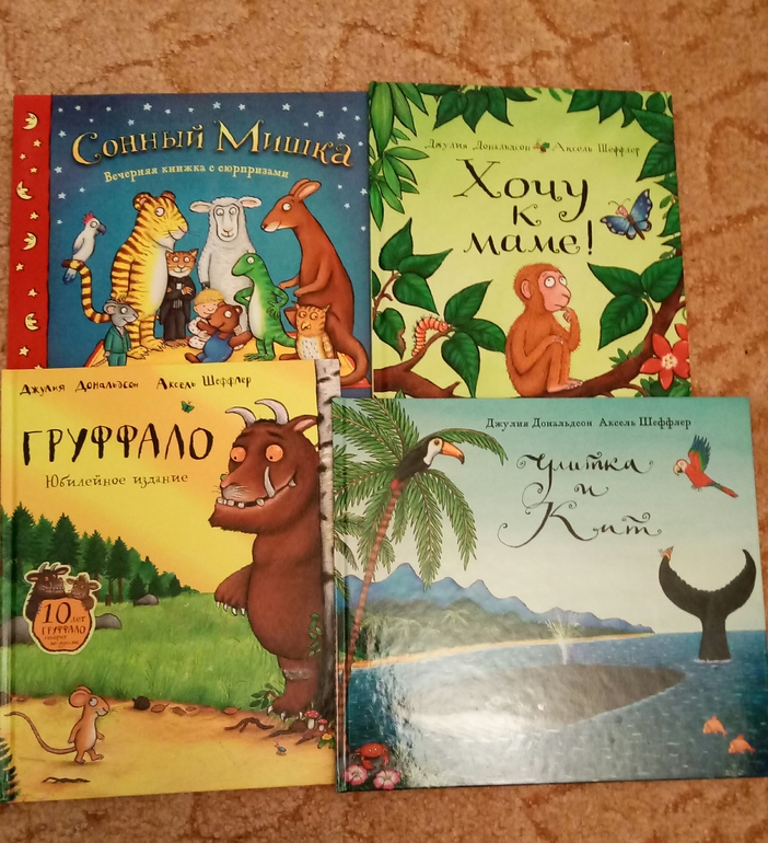 Сонный мишка спорная покупка, как только хочу ее к разочарованиям отнести, сын достает, листает. Но вообщем то могли бы без нее обойтись. Улитка пока тоже не хит, а вот Груффало пришелся по душе, про маму хит давно.