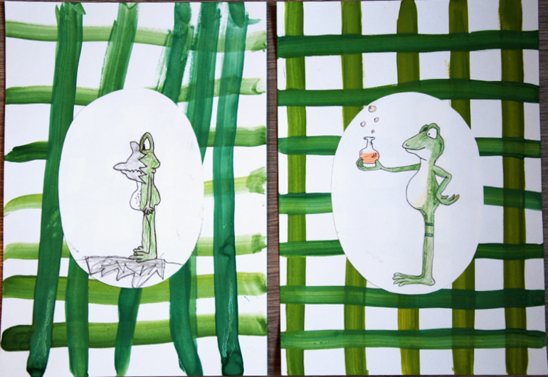 Ну и в конце нарисовали Фроша. У Даниного лягушонка в результате опыта произошёл взрыв, поэтому вся мордочка чёрная.