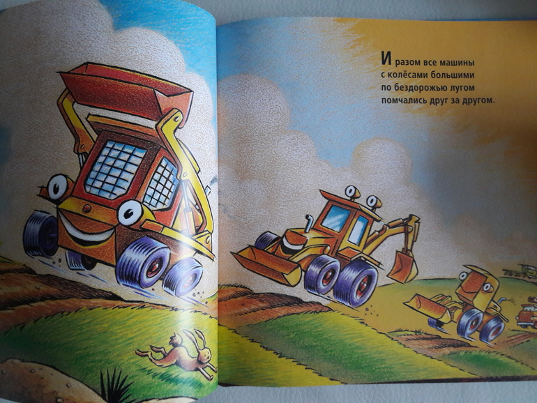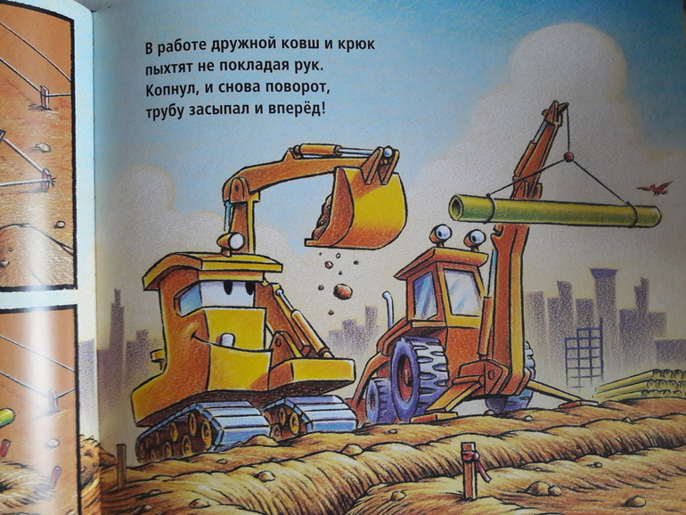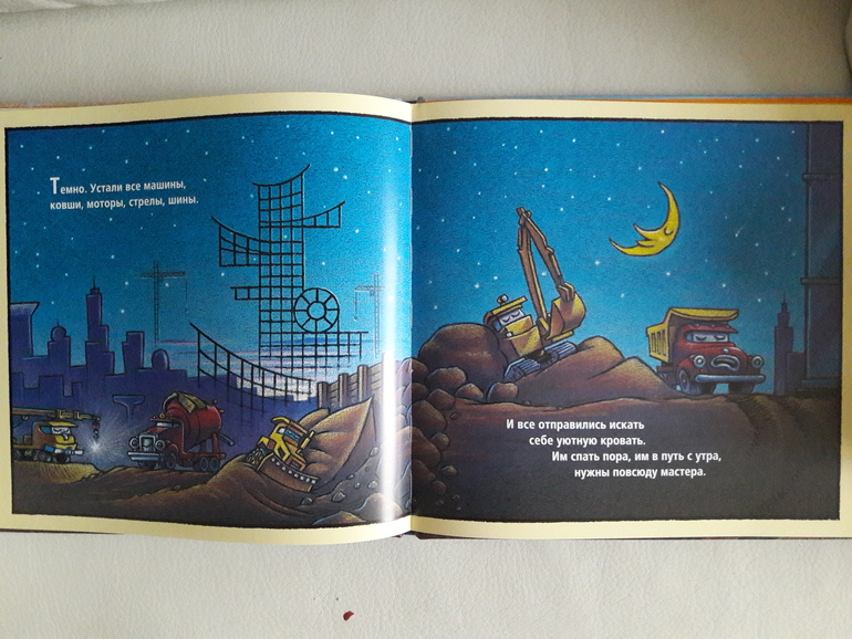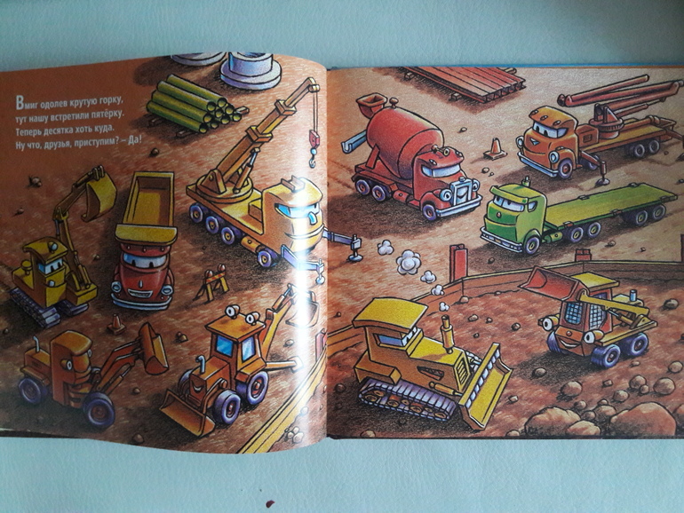 Получив книгу, сын прыгал с ней в обнимку от радости) на книгу у нас такая реакция была впервые)) Теперь читаем ее бесконечно уже неделю, ребенок больше ничего читать не хочет)В истории про стройку машин прибавилось, появились мини-погрузчик с молотом, укладчик, тягач, погрузчик и даже машина-насос, а все вместе "строительных машин-трудяг рабочая бригада". Сама книга по качеству показалась получше, чем Стройка баюшки-баю, ибо бумага в первой рвалась от малейшего неосторожного движения и из новой быстро превратилась в клееную-перекленную, вторая часть пока успешно выдерживает листания 2-х мальчишек)Сама история понятна ребенку 3.5 лет, младшему 1.7, пока не проникся. Иллюстрации красочные, сын здесь даже не возмущается, что у машин есть лица)В общем, книга нам очень понравилась, а у сына стала любимой)Покажу еще немного фото страничек.
