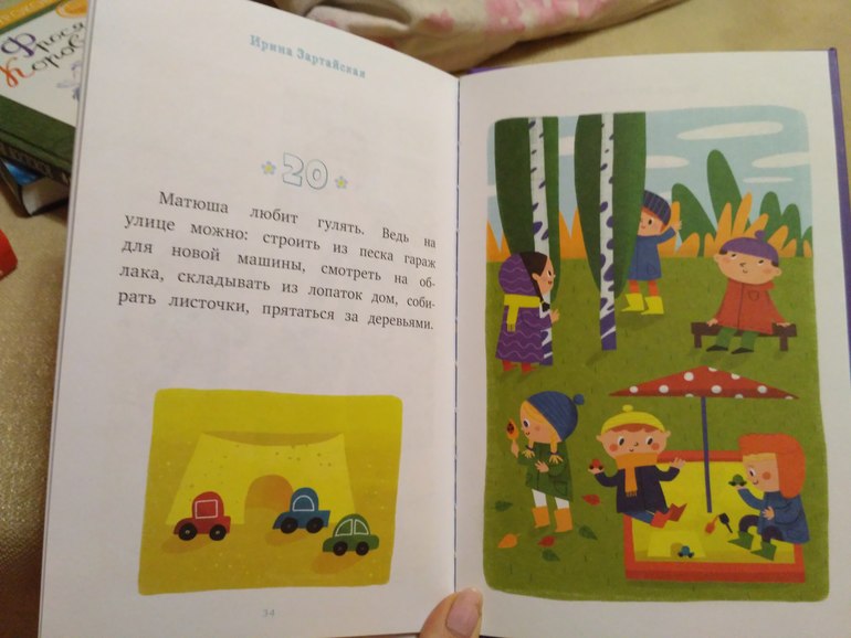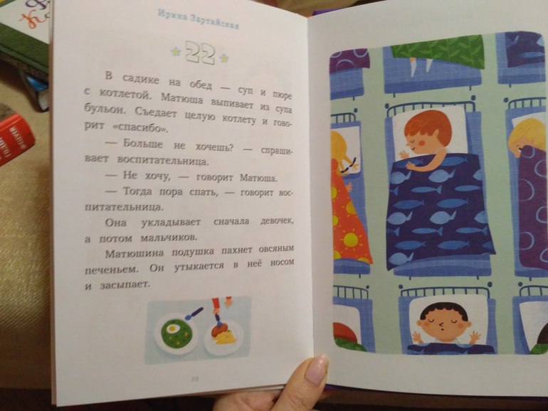 Как попала ко мне в корзину эта книга, вообще непонятно. Внешне она абсолютно клевером скачать, с их одинаковыми иллюстрациями. Наверное, имя автора подкупило- Ирина Заратайская. Текст абсолютно бесхитростный: мальчик Матюша впервые идет в садик. Собственно его первый день и описан. Сначала было грустно, но потом оказалось, что в садике не так всё и плохо.Очень просто, простыми предложениями. Без лишних описаний. Для взрослого покажется стилистически похожим на какой-то языковой учебник. Но может это и подкупает? Лесе книга однозначно понравилась. Просит читать про Матюшу.