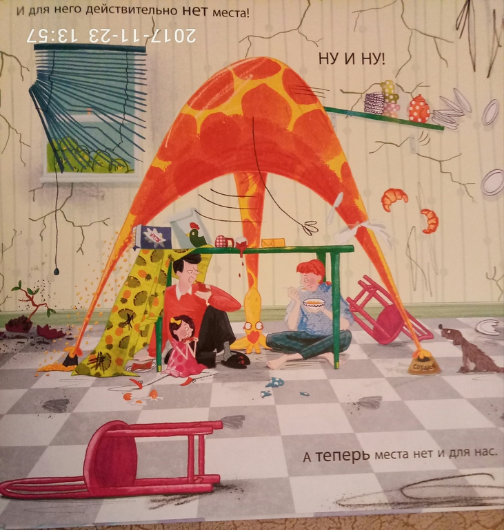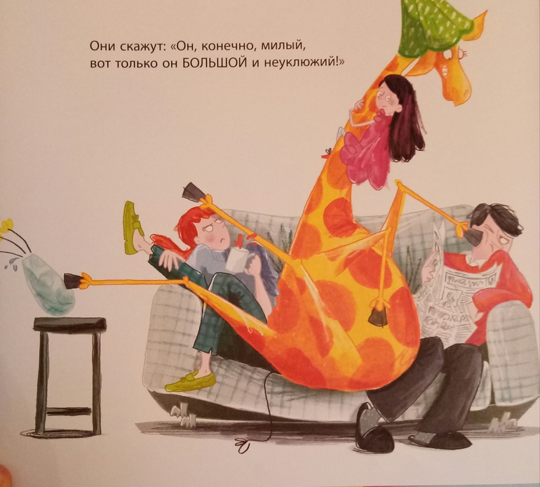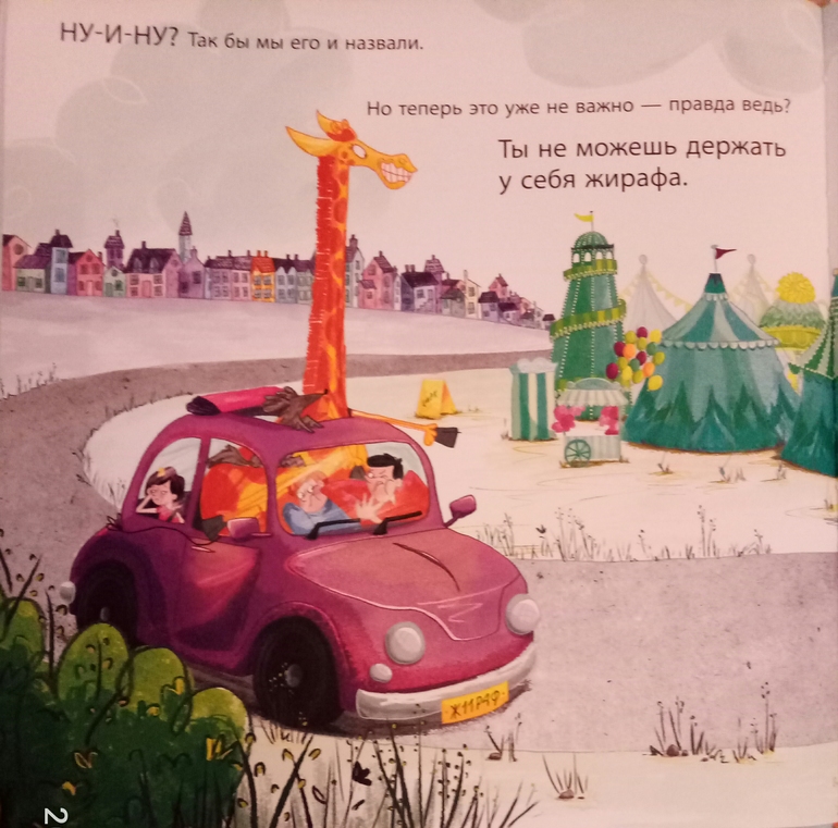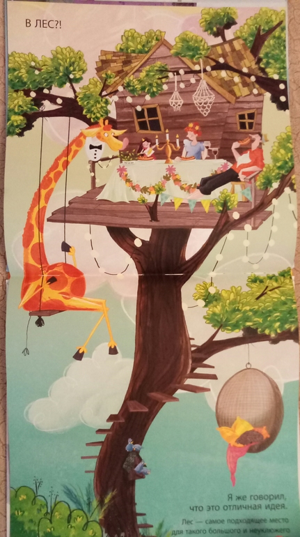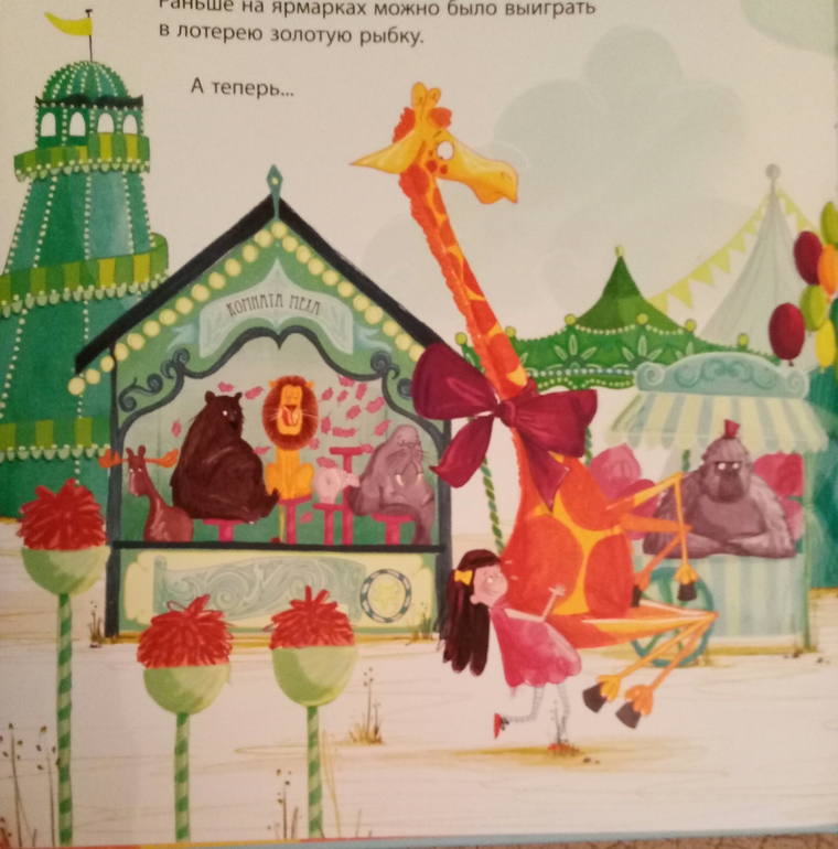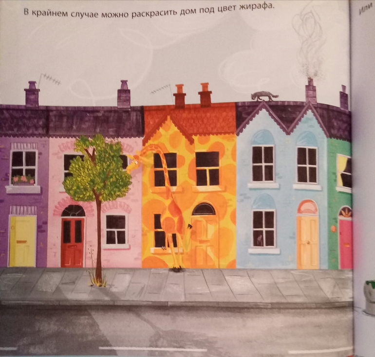 И хотя книги этого издательства я покупаю очень и очень редко, именно эту ну очень мне захотелось именно из за ее красочности и яркости!это не книжка это взрыв красок и цвета!Ну просто книжный скитлс)) На обложку смотришь, и уже настроение повышается) И текст под стать рисункам, веселый, озорной) Вот Вы бы куда дели жирафа, если бы выиграли его в лотерею?