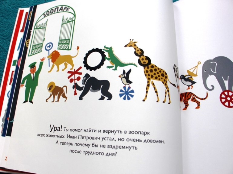 Взрослому не надо читать подписи к картинкам или говорить, что сделать. Даже самый маленький быстро понимает, что в окно машины можно заглянуть, если взять волшебную лупу. А в машинах чего только нет! Кроме сбежавших животных там попадаются еще люди-чайники, прищепки, спасательные круги; сони-засони поперек лобового; полный набор домашней утвари и игрушек; чуды-юды и рыбы-крабы; еж в каске и без каски; Мерлин и еще тысяча «а кто это?» и «мама, смотри киса!». Погорячилась я, написав «сам играет», да? )))