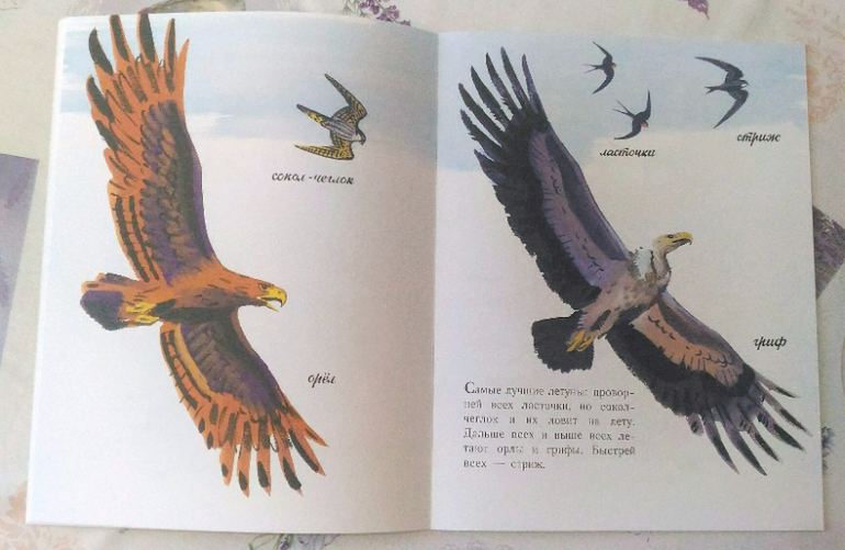 Формат маленький. Красочные рисунки птиц. Фазан, лебедь, утка, канарейка.... Ну очень красивые! Под русским названием птиц написано название на английском, без транскрипции.