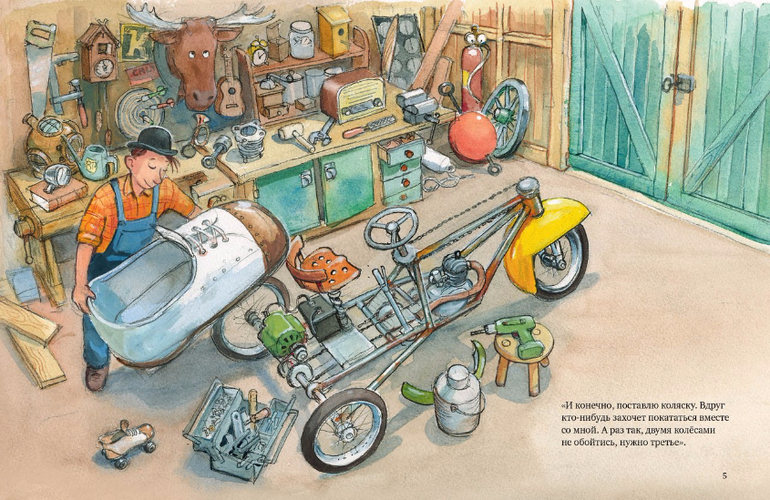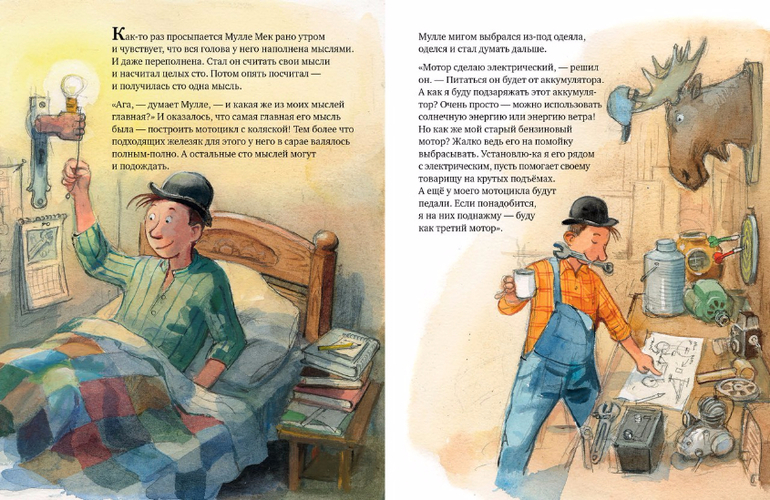 Кстати, как раз в тот день, когда Мулле Мек встретил Буффу, он собственными руками собрал свой первый мотоцикл - да не простой, а с двумя, нет, даже тремя моторами, солнечной батареей, воздушным винтом и коляской. Как всегда - из ненужного хлама и железяк, что валялись у него в сарае. Об устройстве этого необычного мотоцикла тоже можно узнать из книги "Как Мулле Мек и Буффа стали друзьями".