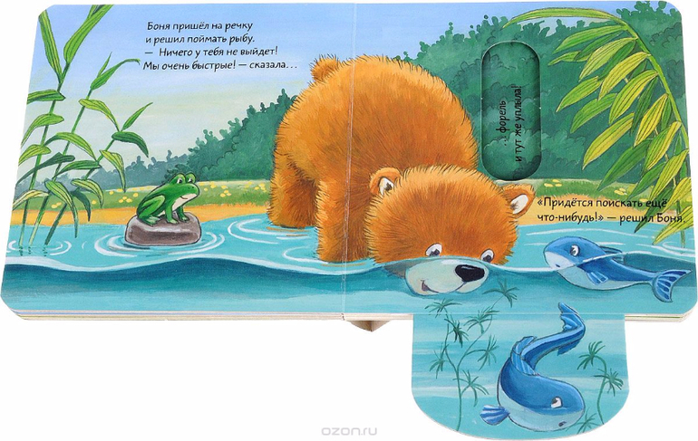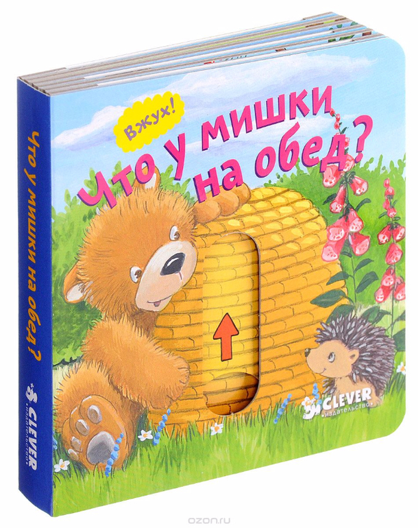 Однажды медвежонок Боня страшно проголодался. Он заглянул в пчелиный улей, но не нашёл там ни капельки мёда. Где же ему найти обед? На каждой странице книжки-игрушки "Что у мишки на обед" есть стрелочки или колесики, которые нужно потянуть, покрутить, и тогда под ловкими пальцами малыша оживут звери и птицы, деревья и прекрасные цветы.