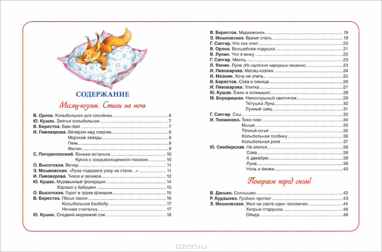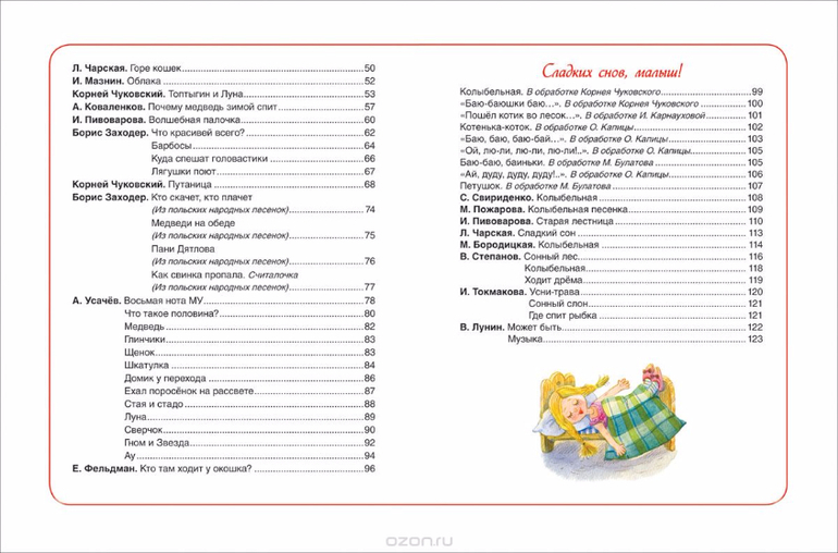В вечерний час, когда за окном темно, а на небе появляются яркие звездочки, малышам пора ложиться спать. Тогда мама или папа откроет эту волшебную книжку, в которой собраны все лучшие колыбельные, песенки и стихи, и начнет читать. Стихи Бориса Заходера, Корнея Чуковского, Андрея Усачева, Генриха Сапгира, Эммы Мошковской, Юлии Симбирской и других замечательных авторов, и, конечно, всем знакомые народные колыбельные и потешки подарят малышам много приятных минут и помогут маленьким непоседам сладко уснуть.