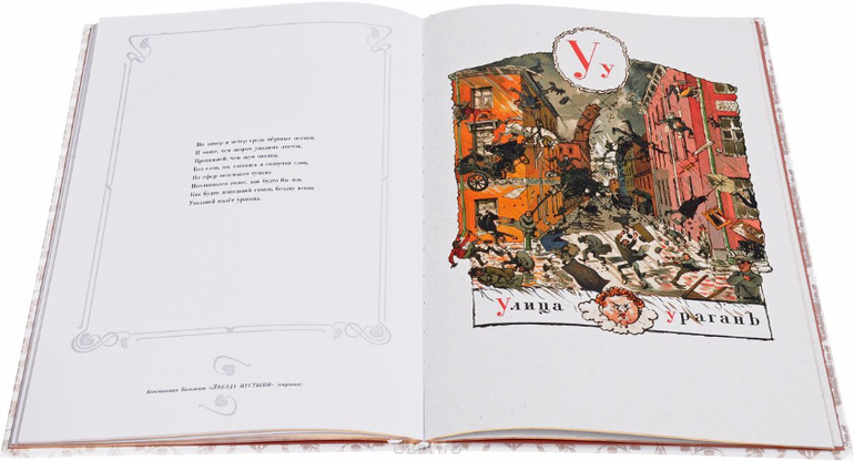 Главное в этой детской книге - мир образов в тридцати с лишним "картинах", иллюстрирующих один за другим каждый азбучный знак. По данной традиции для этого подбирались вещи с названиями, начинающимися с данной буквы (или, в крайнем случае, содержащими её). Но Бенуа не захотел ограничиться отдельными предметами или фигурами, он включал их в соответствующую выразительную среду, окружал десятками любопытных подробностей, объединял занимательным действием. Получались "картины", которые можно бесконечно разглядывать, вживаясь в сюжет, дополняя и развивая его собственной фантазией.