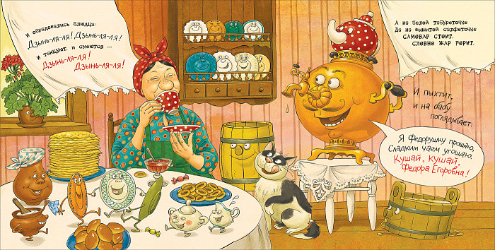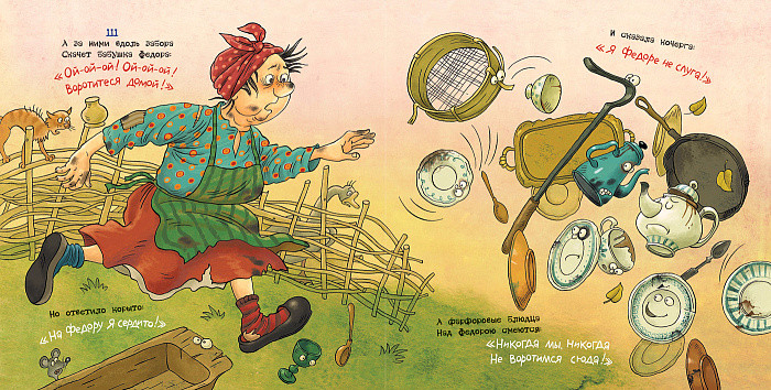 «Скачет сито по полям, а корыто по лугам...» - эти легкие, ритмичные строчки знакомы и детям, и взрослым. Сказка Корнея Чуковского «Федорино горе» с великолепными иллюстрациями Ольги Громовой - долгожданная новинка в нашей серии «Куча-мала»: музыкальное звучание этих стихов прекрасно обыграно в необычном макете и оформлении книги. Эта сказка была написана после жаркого летнего дня, проведенного Корнеем Ивановичем в компании знакомых детишек на берегу ручья. «Эта трехчасовая свобода от взрослых забот и тревог, это приобщение к заразительному детскому счастью, эта милая пыль под босыми ногами, это вечереющее доброе небо - все это пробудило во мне давно забытое упоение жизнью, и я, как был в измазанных штанах, взбежал к себе в комнату и в какой-нибудь час набросал те стихи, которые с позапрошлого лета безуспешно пытался написать... я ощутил и попытался передать на бумаге ритмическим звучанием стиха движение каждой даже самой крохотной вещи, пробегающей у меня по странице» - пишет он в своем дневнике.