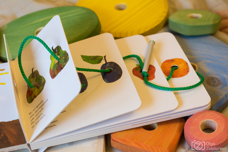 Зарубежной литературы пока совсем немного. Это Очень голодная гусеница Не могу принять иллюстрации Э.Карла, но в этой книге они, как мне кажется, приятны. К тому же мне нравится ненавязчивый образовательный и воспитательный моменты в его книгах и элемент интерактивности. Гусеница стала для меня компромиссом. Я бы не сказала, что книга произвела вау-эффект, но определенно понравилась. В будущем я еще планирую привлекать гусеницу для разных игр и развивашек как хорошо знакомый персонаж, пока же мы читаем эту книгу неизменно с"гусеницей" в руках, наспех сделанной мною из подручных материалов. Мне кажется, к этой книге какой-либо шнурок должен по умолчанию идти в комплекте, но его почему-то нет. 🤔