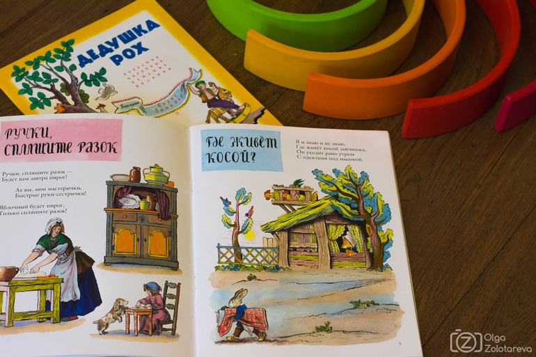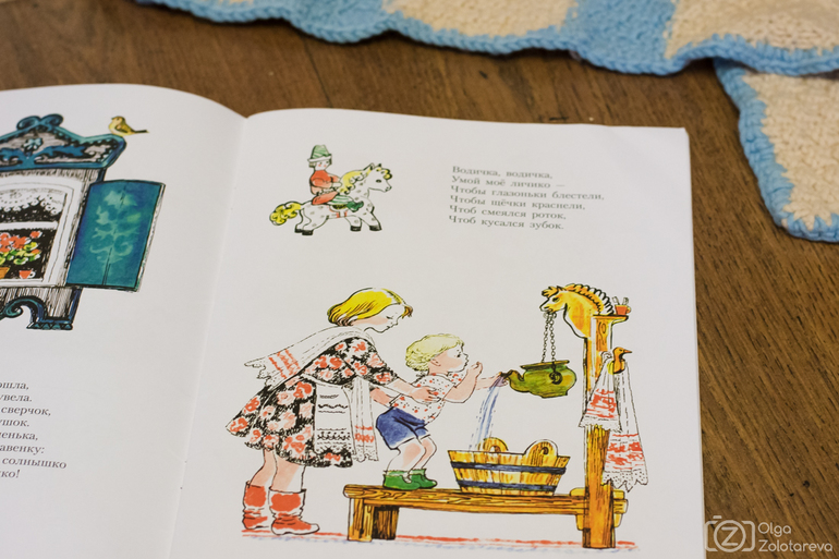 Своеобразная книга. Наверное, многие сочтут, что она малоинтересна из-за блеклых иллюстраций или обилия урожайно-колхозной тематики))) Спорить не буду. Но нами эта книга очень любима: особенно часто рассматривались (и читались мною) стишки про детишек "Две Ульки в люльке качаются", умывательная "Водичка-водичка", и бодрая звонкая потешка про трактора.