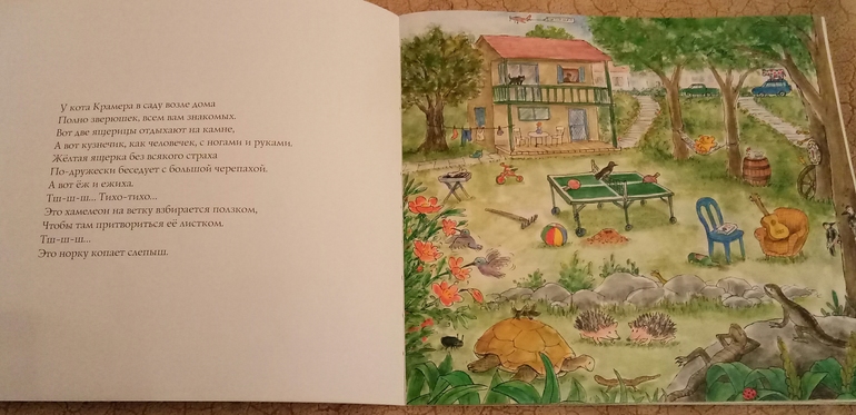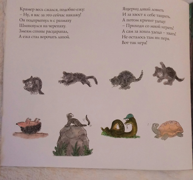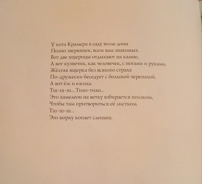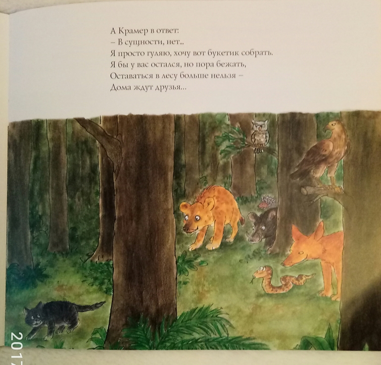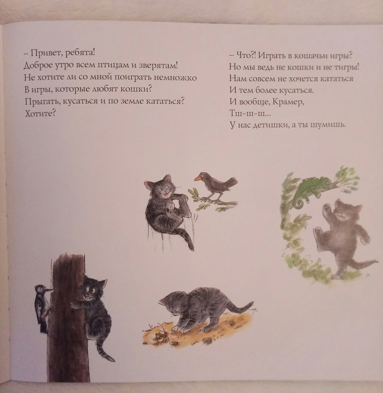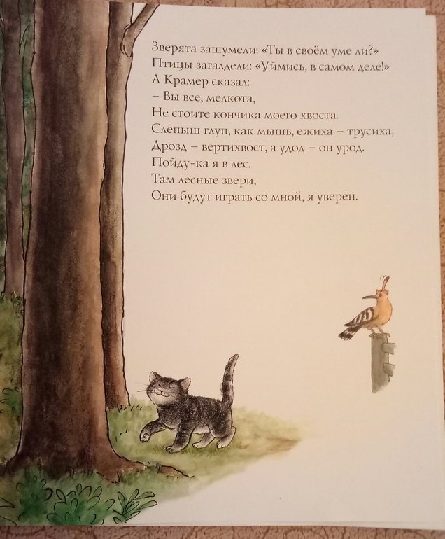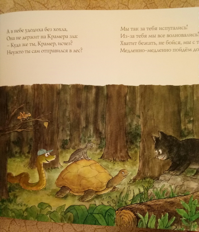 Кот Крамер идет в лес Автор Меир Шалев, художник Йоси Абулафия издательство Текст. Про этого автора ничего не слышала, а он, оказывается, известный израильский писатель, и в России уже много его книг выходило. Но меня в этой книге с первого еще анонса зацепили рисунки!Но потом что меня отвлекло, и я забыла заказать) Потом и здесь книгу показали подробно, и тогда я точно решила надо! и опять не сложилось) и только в эту черную пятницу выбираю я товар на сто рублей,и этот котенок прямо таки выпрыгнул на меня) и за 130 руб я его конечно, наконец то заказала) Ну что хочу сказать,такого эффекта я не ожидала! хотя я сначала была немного разочарована, стих на мой взгляд , в некоторых местах хромает и читается как то криво..но рисунки, это чудо просто!