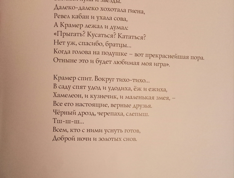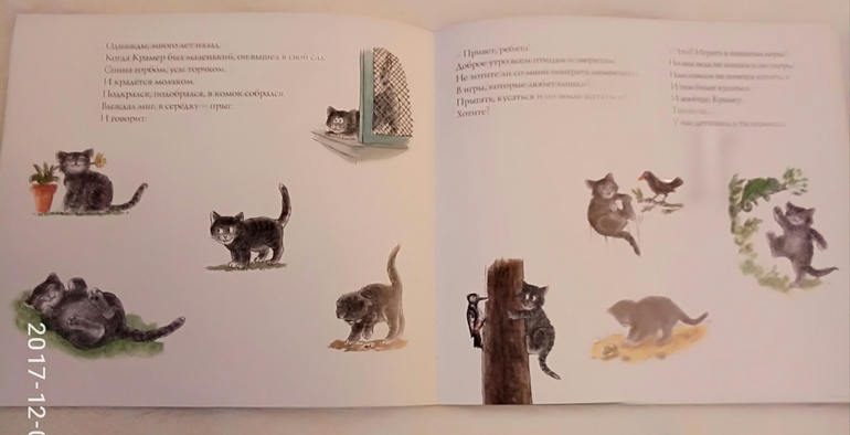Так что ко всем плюсам, это еще и засыпательное стихотворение) Я честно, не нарадуюсь, а про сына и говорить нечего! Чем то очень зацепил его этот озорной котенок!а если взглянуть поглубже, можно обсудить и многие вопросы поведения, драки, уход из дома, и умение прощать и не обижаться!но это чуть позже, а пока мы каждый день просто читаем, как котенок Крамер ушел из дома и что из этого вышло)