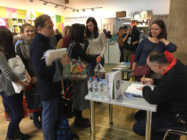 Пока писала вступительную часть, столько воспоминаний всплыло из первой поездки... Вот например, самой большой мечтой было - познакомиться с Максимом Митрофановым. Я считаю, что это счастье книголюба, найти своего автора и художника. Когда ты видишь все подтексты, которые "спрятал" автор или чувствуешь линию и цвет художника. Так вот я нашла! :)) Ну мои любимые авторы меня уже ничем новым не порадуют, а вот художник не перестает удивлять. Коленки до сих пор помнят, как было страшно подойти первой и познакомиться :))) Для меня он вообще пример как надо относиться к своему делу. Если вам когда-нибудь удастся послушать о его работе над той или иной книгой, вы поймете как МНОГО он изучает материала прежде чем сесть рисовать.