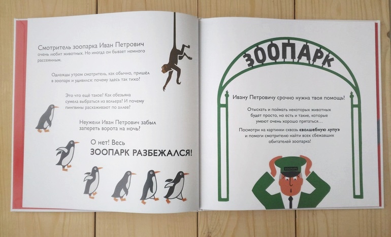 На каждом развороте дается мини-легенда о том, как звери попали в ту или иную обстановку, и задание по отлову сбежавших: