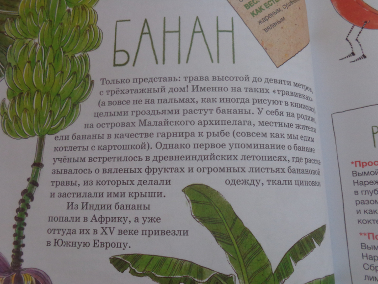 Каждому фрукту выделено по 1 развороту и тоже рассказано о происхождении, краткое описание, очень занимательные факты + 2 рецепта приготовления) Иногда читаешь и думаешь - "Да ну! Что, правда, что ли? Может, врут?", но Фиксики вроде не обманывают))) Иллюстрации очень нежные, прям "мои-мои"!