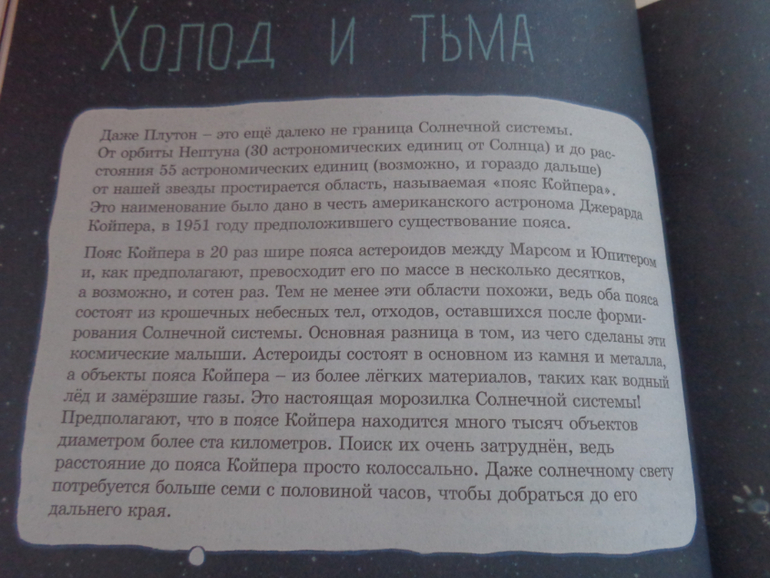 Каждая планета описана, рассказано о предположениях ее происхождения, времени открытия, основных отличительных признаках. При этом ни капельки не скучно!э