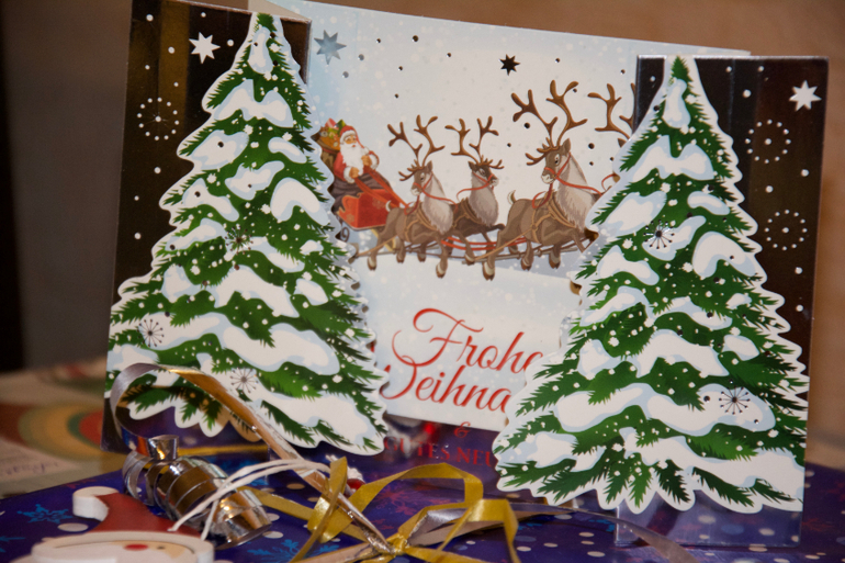 Безумно красивая Рождественская открытка! С Сантой и оленями!Елочки со снежинками выпригивают из! Сквозь открытку! Вне открытки!