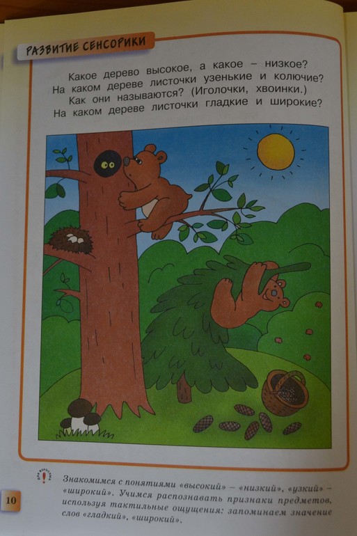 Это же относится и к понятиям «высокий-низкий». Чем ребенку дофантазировать, где там дерево заканчивается, нужно было хотя бы до верхушки его нарисовать. А елка сливается с окружающим фоном и стоит неровно, но это уж я придираюсь.