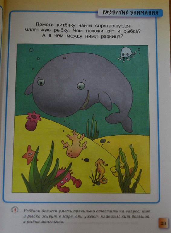 Стр. 23 - нужно найти маленькую рыбку и сказать, чем похожи кит и рыбка, а чем они отличаются. Видимо, автор опять не учел нескольких фактов, например, что морской конек - это тоже рыбка. По его замыслу, предполагается, что ребенок должен заметить только неопознанную рыбку в водорослях. Но тут можно отмазаться, вроде «нашли конька - тоже молодцы». Зато кит и рыба, оказывается, отличаются только размерами. То, что кит относится к классу млекопитающих, а гипотетическая «рыба» (хоть бы уж конкретную рыбу изобразили) к классу рыб вновь ускользает от внимания составителей теста, то есть различий у них не перечесть, как пример: у рыбы плавники, а у кита ласты. Есть такая рыба, как китовая акула, которая тоже может достигать больших размеров, но тем не менее, это рыба. На картинке акулы нет, однако пояснение можно было сделать. А потом ребенок будет считать, что основное отличие этих животных исключительно в их размере. Если уж малыш должен знать названия птиц, то почему бы ему не изучить классы животных, если это служит основой классификации, их не так и много, тех что нужно знать, основные - ракообразные, насекомые, паукообразные, рыбы, звери (млекопитающие), рептилии (пресмыкающиеся), амфибии (земноводные)? Это лишь звучит страшно, а на самом деле легко. К примеру, мы видим на картинке лягушку и говорим - это амфибия, а кто еще относится к амфибиям? - тритоны, жабы и т.д.