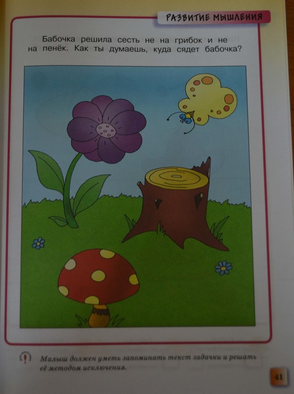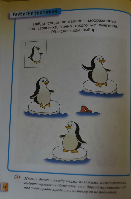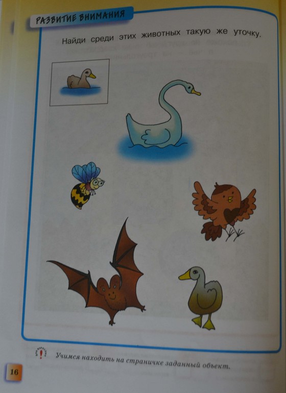 Почему утка такого цвета??? Она болеет? А пингвины все одинаковые. И почему если в первом задании утки в воде и на суше - одинаковые, то уже в следующем пингвин, поднявший вверх крыло или повернутый в другую сторону отличается от остальных? Я считаю, в заданиях подобного типа нужно указывать признак сходства или различия. Это мы, взрослые (и то не всегда) можем сходу определить, чем отличаются предметы. А ребенку стоило бы уточнить - «какие пингвины смотрят в одну сторону», или «покажи уточек одного цвета», «покажи фигурки, одинаковые по…форме/цвету/размеру». Кстати, неопределенная птица в первом задании вновь скопирована со «снегиря», и тут появляется еще один персонаж - «не то оса, не то пчела». Одно из заданий развеяло мои терзания на этот счёт. Крылатое нечто не раз еще встретится на страницах данного пособия.
