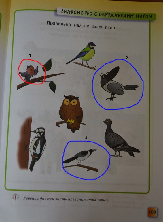 Стр. 109 - ребенок должен звать названия этих птиц. Птица под №1 - снегирь? Если да, то почему художник не учел хотя бы того факта, что это кочующая птица (не перелетная, но и не везде оседлая), и ее гораздо вероятнее встретить зимой, чем летом? А птицы 2 и 3 чем отличаются, кроме гигантского непропорционального клюва? Ну я-то понимаю, что под №3 хотели изобразить сороку, а №2 - это ворона. А может и нет. В общем, художник, как видно из других картинок, всех птиц рисует одинаково. Зелёная синица тоже радует. А сова солидарна со мной, вон как глаза таращит, думает видно «Куда я попала, кто все эти существа?». Повезло одному дятлу, пожалуй, с ним очень уж сложно напортачить.