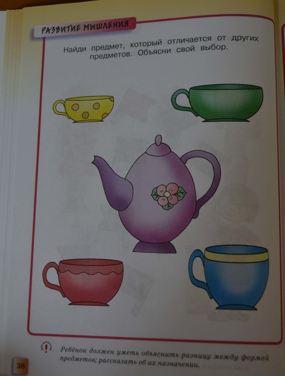 Опять сходство и отличие, и опять не указан признак (точнее, он написан в пояснении - форма и функция, а почему в вопросе его нет, остается на совести авторов). К примеру, можно исключить зеленую чашку, потому что на ней нет рисунка.