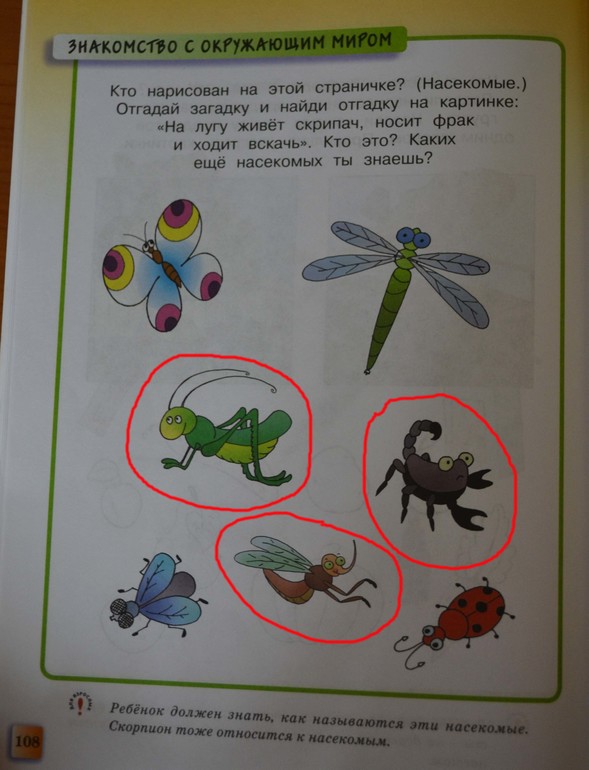 Я редко пишу отзывы, сказывается лень. Однако в этом случае стимулом мне послужило задание со стр. 108. Итак, простой вопрос - кто нарисован на этой страничке? И ответ - насекомые. Нет, даже так, НАСЕКОМЫЕ, Карл!!!! Недоуменно взирает на нас со странички скорпион… Во взгляде его читается вселенская грусть и безмолвный вопрос: «Доколе?!!!!» Вы только посмотрите на его печальную рожицу, да-да….Дело в том, что скорпион относится к паукообразным. Что такого, подумаете вы, может быть автор случайно ошибся или это вообще не имеет значения. НО!!! В пояснении еще раз подчеркивается данный факт. И это грубейшая ошибка, тем более в развивающем пособии. Паукообразые по множеству признаков отличаются от насекомых (кому интересно, может почитать об этих различиях в интернете или в соответствующей литературе). К примеру, есть такая серия у Экзамена - Познавательные сказки. В книге «Мастер паучок» занимательно в виде коротенькой сказки для детей описаны эти отличия (на примере паука и муравья). Скорпион и паук относятся к одному классу. Теперь обратите внимание на комара. Вообще тут все картинки достойны восхищения, но комар, в отличие от скорпиона, явно в восторге, что его не исключили из класса насекомых и не приписали, ну скажем, к птицам. А то чего доброго, вообще понизят в звании и совсем выбросят из царства Животные (чем черт не шутит!). А хоботок-то, хоботок, вон как изогнул….жаль только, что с таким хоботком ему придется сильно извернуться, чтобы попить кровушки. Представила себе эту картинку - вышел какой-то сюрреализм…Впрочем, напрасно он радуется, ведь у него по неизвестной причине осталось лишь 2 лапки из 6. А может зря я придираюсь к художнику, и он всего лишь изобразил раздавленного комара, так сказать, погружение в суровую реальность, то-то комара так покорежило. Кузнечик тоже где-то потерял 2 лапки…но он не унывает. Лишь мухе и божьей коровке (где только такую божью коровку можно увидеть, кроме своих фантазий??? Хм, а может это клоп-солдатик?) старательно изобразили все шесть лапок в полном количестве. С другой стороны, у кузнечика и комара сохранилось хотя бы несколько конечностей, а вот бабочке и стрекозе в этом отношении повезло меньше…