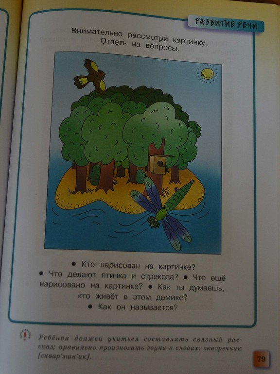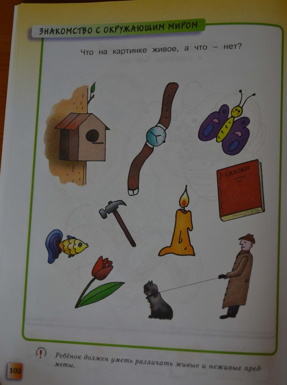 А теперь сюрприз - к этому заданию претензий нет. Просто напишу некоторые мысли по данному вопросу. Я столкнулась с проблемой, как объяснить ребенку, что такое жизнь, чем живое отличается от неживого. И пришла к выводу, что сначала можно просто называть некоторые признаки живого и говорить, что живое, а что нет на примерах. То есть, живые - растения, животные, люди. Живые существа дышат, пьют воду и т.д. В русском языке с этим связаны некоторые трудности. Например, дерево живое, но про него говорится «оно», как о неживом предмете. Есть еще понятие «одушевленный-неодушевленный предмет». Опять же, в альбоме по развитию речи есть такой признак - если предмет может самостоятельно двигаться, значит его относим к одушевленным и задаем вопрос «кто». Я с этим не могу согласиться. Пример то же самое дерево, утверждается, что оно не может совершать движения самостоятельно, но на самом деле любой живой объект, в том числе и растения, совершают движения, только у растений они ПАССИВНЫЕ - рост корня, стебля и листьев, поворот листьев, подсолнух поворачивает цветок к солнцу, лепестки цветка раскрываются утром или вечером, в то время как у большинства животных движения АКТИВНЫЕ. Всем известное растение мимоза может моментально сложить свои листики, ловушка венериной мухоловки схлопывается, и в нее попадают насекомые. Но и среди животных есть такие, которые перемещаются пассивно, например, планктон, коралловые полипы, сидячие и прикрепленные животные и т.д. В общем, это сложный философский вопрос «Что есть жизнь»! И движение - один из признаков всего живого в целом! Дерево, на котором висит скворечник, судя по картинке живое J Поэтому ребенку можно просто сказать, что растения живые, но в качестве исключения к ним мы задаем вопрос «Что это?». Допустим, «растет что? - цветок, но кто? - малыш».