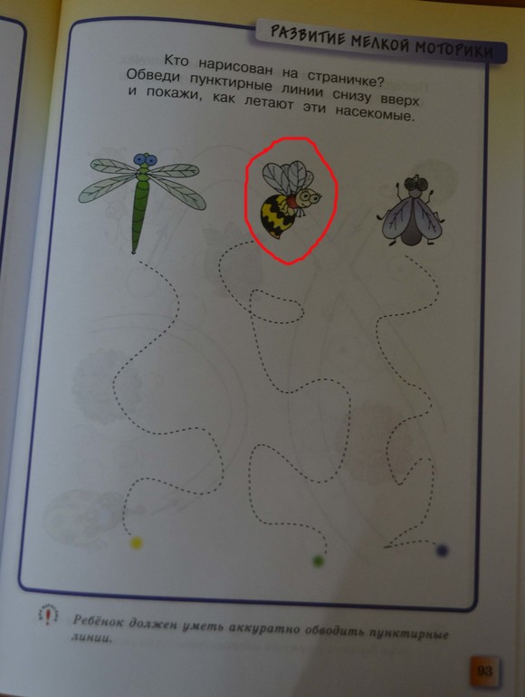 Знакомое крылатое существо, на следующей картинке мы узнаём, что это действительно пчела. Вообще то я не против, когда пчелу в детских книгах изображают в сапожках, с платочком или даже с ведёрком, в которое она собирает нектар. Но зачем ей рисовать узор как у осы и брюшко такое же по форме? В других книгах тоже такое встречается, к примеру, в альбоме по развитию речи Батяевой нарисованы шмели, а подписано, что это пчёлы, в книге «Кто разбудил детку» тоже явный шмель….неужели так сложно изобразить нормальную пчелу? Или это из той же оперы, что «скорпион, рак и кузнечик - это всё насекомые».