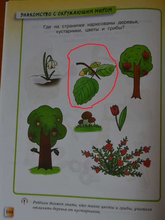 В этом задании почему орешник не нарисован полностью, кустом? Как малыш отличит кустарник от дерева, по плодам-орешкам или ветке? Но ведь высота - основное отличие этих понятий. А если ребенок уже знает, что орешник - это кустарник, тогда в чем состоит функция пособия? Надо было всё изображать ветками, и малыш должен угадать где что…Хотя вот в нижнем углу я сама куст не идентифицировала. Что есть сие, клубника-мутант? Автор об этом таинственно умалчивает даже в пояснении.